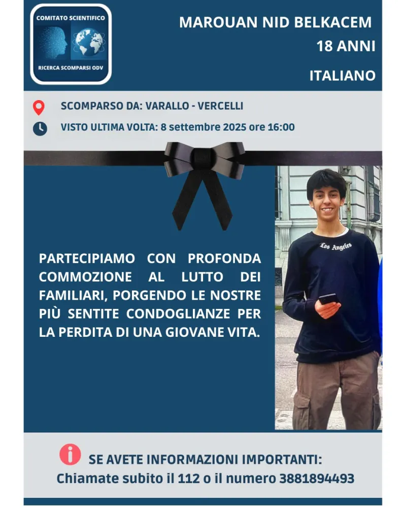 Tragico epilogo per Marwan Nid Belkacem, il diciottenne scomparso da Varallo Sesia lo scorso 8 settembre 2025.