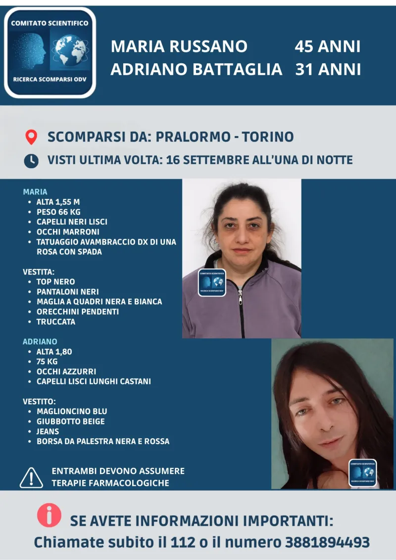 Sono ore di apprensione per due persone scomparse, rispettivamente Adriano Battaglia e Maria Russano, entrambi allontanatisi da Pralormo, in provincia di Torino il 16 settembre 2025.