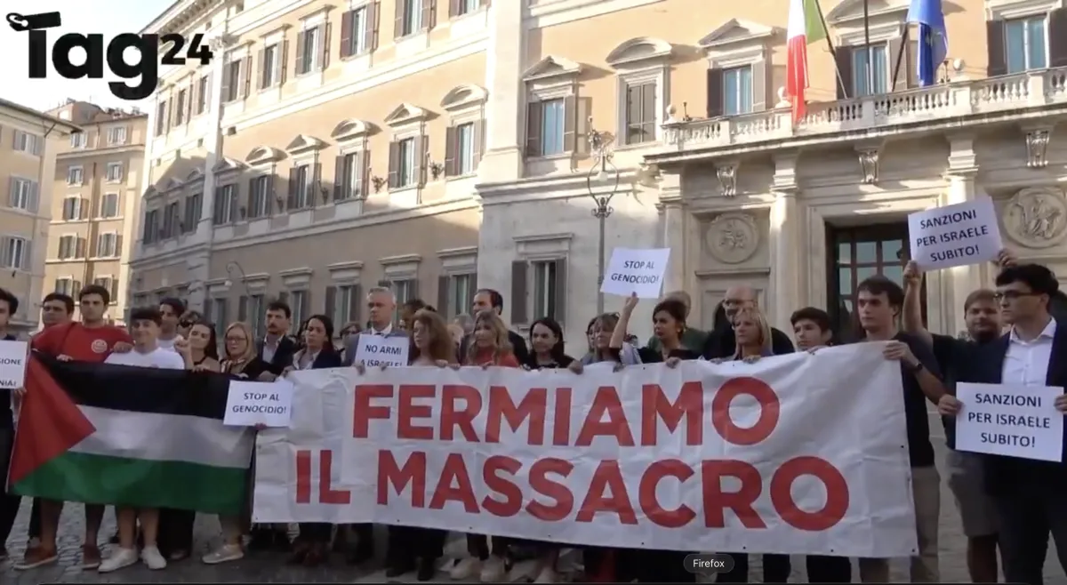 Questo pomeriggio, davanti a Montecitorio, si sono radunati alcuni deputati del Partito Democratico e diversi esponenti delle giovanili dem per condannare le azioni militari israeliane a Gaza delle ultime ore. Un'iniziativa che vuole spingere il governo Meloni ad allinearsi alla richiesta di sanzioni nei confronti di Israele. Le misure erano state annunciate già da qualche giorno dalla presidente della Commissione von der Leyen e, a seguito degli ultimi avvenimenti, sono diventate un'urgenza.