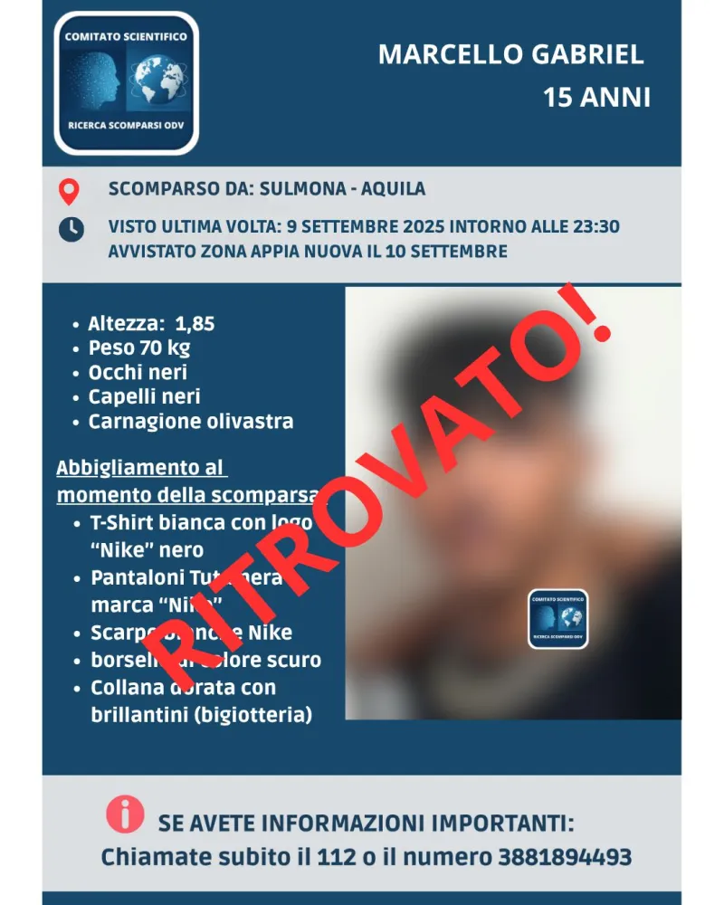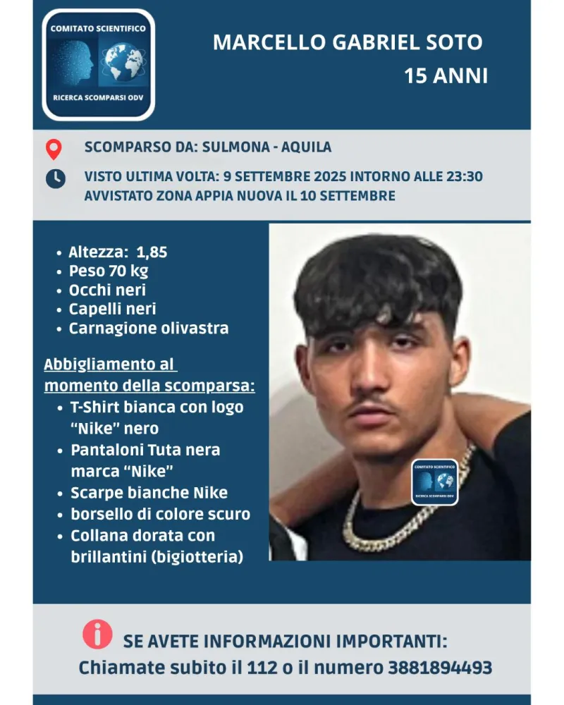 Sono trascorsi dieci giorni dalla scomparsa di Marcello Gabriel Soto, l’adolescente allontanatosi da Sulmona, in provincia dell’Aquila, lo scorso 9 settembre 2025.