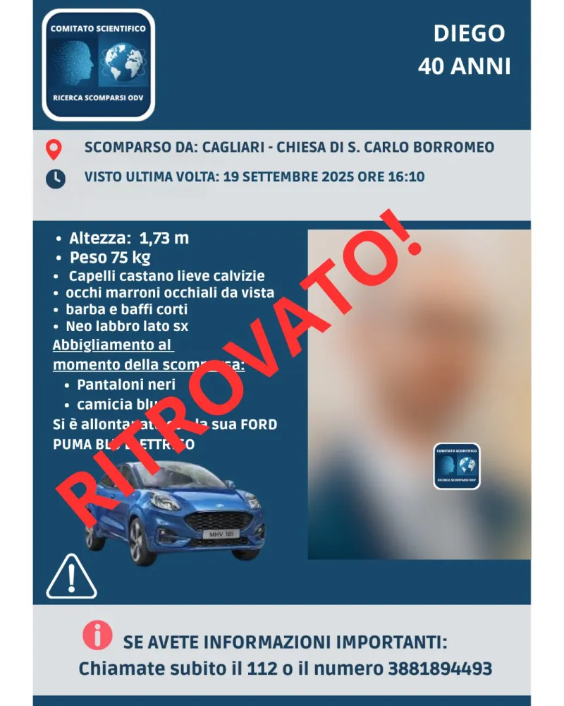 Lieto epilogo per Diego Lai, l’uomo scomparso da Cagliari il 19 settembre 2025 in circostanze preoccupanti.