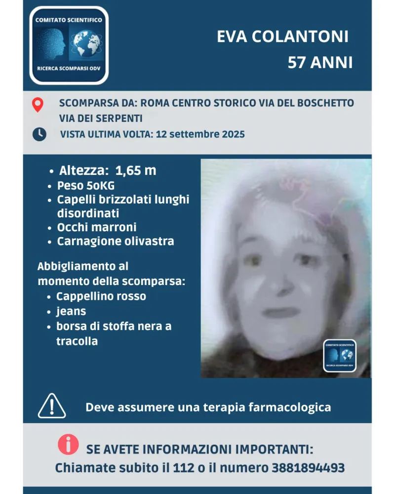 Sono trascorsi oltre dieci giorni dalla scomparsa di Eva Colantoni, avvenuta a Roma il 12 settembre 2025 in circostanze allarmanti.