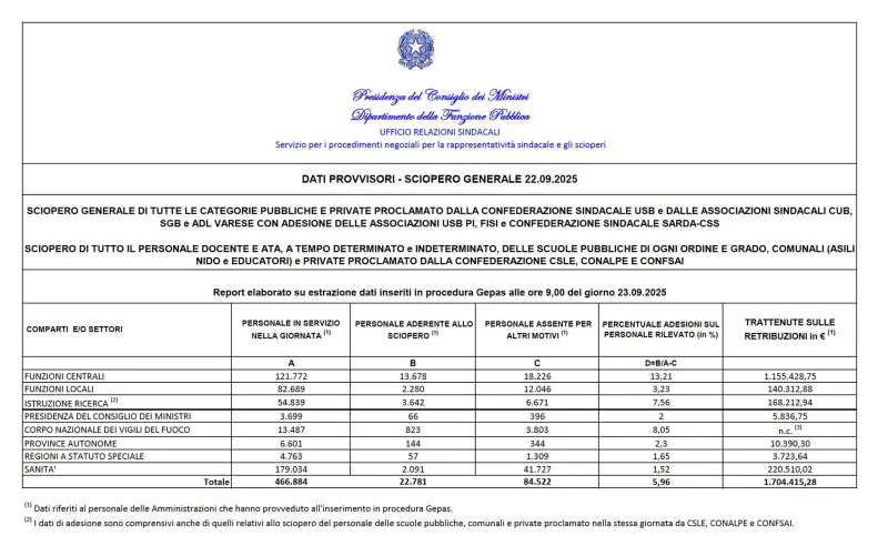 La prima conta il personale in servizio nella giornata di ieri (in tutto 466.884 dipendenti pubblici). Poi c'è quella del personale che, in numeri assoluti, ha aderito allo sciopero (22.781). La terza colonna attiene, invece, il personale assente per altri motivi (84.522).
