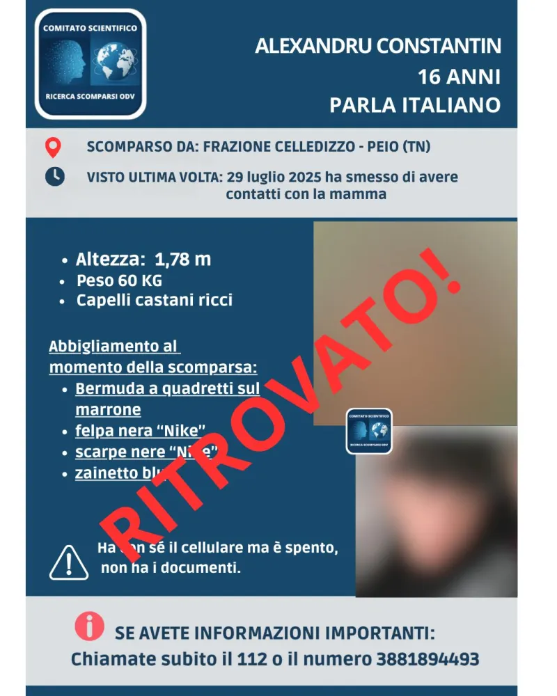 Lieto epilogo per Alexandru Constantin Hrusca, il giovane scomparso in circostanze allarmanti da Peio, in provincia di Trento, lo scorso 29 luglio 2025.