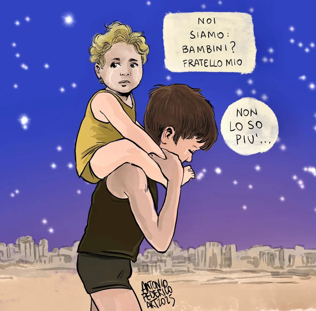 E’ un disegno che parla più di mille parole. Porta con sé un messaggio forte e doloroso, quello della condizione dei bambini a Gaza. La Nazione è andato a trovare l’autore dell’opera: si chiama Antonio Federico, ha 43 anni, è di Reggio Calabria, scrittore, artista e docente per il terzo anno al liceo artistico "Stagi" a Pietrasanta, dove sogna di stabilirsi in pianta stabile (è di ruolo al "Brunelleschi" di Prato). Protagonista della sua opera è il dialogo tra i due bimbi: "Noi siamo bambini, fratello mio?", "Non lo so più".