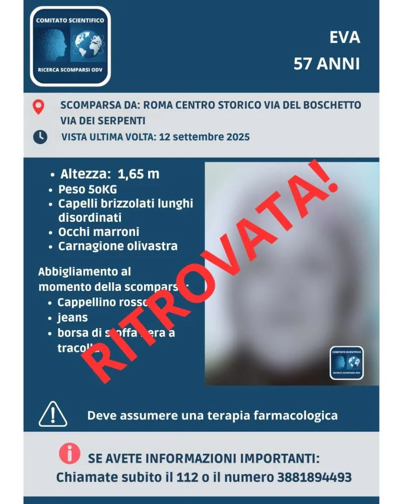 Lieto epilogo per Eva Colantoni, la cinquantasettenne scomparsa da Roma lo scorso 12 settembre 2025 in circostanze che avevano destato forte preoccupazione.