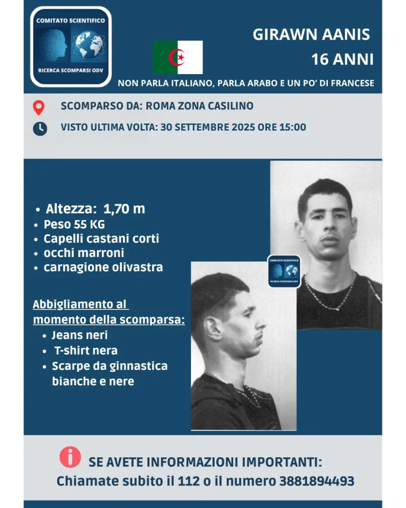 Sono ore di apprensione per Girawn Aanis, il sedicenne scomparso da Roma, il 30 settembre 2025 in circostanze allarmanti.