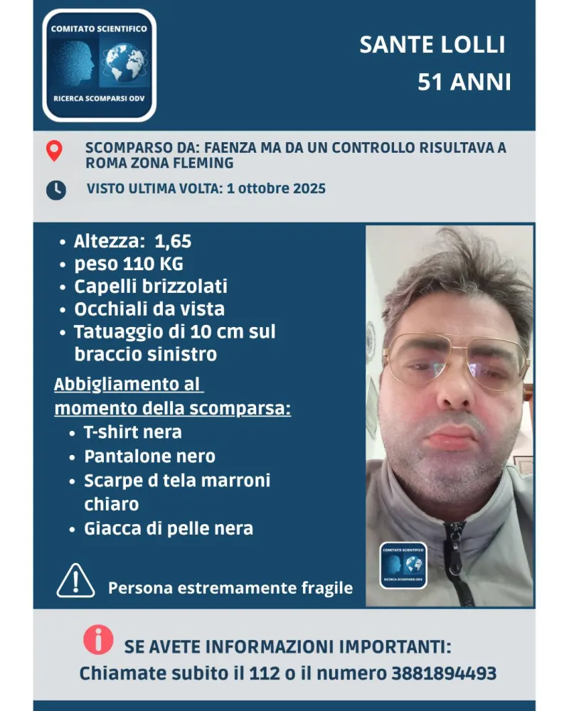 Sono giorni di apprensione per Sante Lolli, l'uomo scomparso da Faenza il 1° ottobre 2025 in circostanze allarmanti.