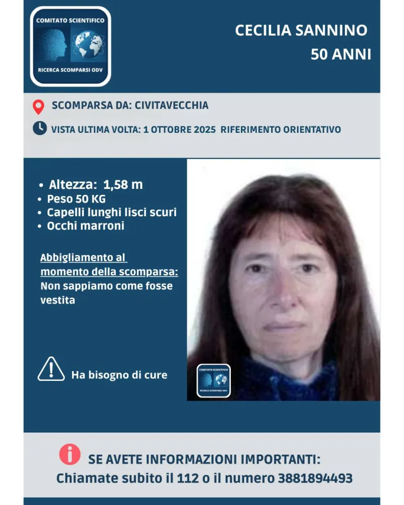 Sono passate due settimane dalla scomparsa di Cecilia Sannino, la donna scomparsa da Civitavecchia il 1° ottobre 2025 in circostanze allarmanti.