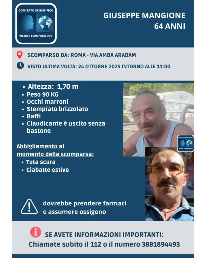 Sono giorni di grande preoccupazione per Giuseppe Mangione, l’uomo scomparso da Roma il 24 ottobre 2025 in circostanze allarmanti.