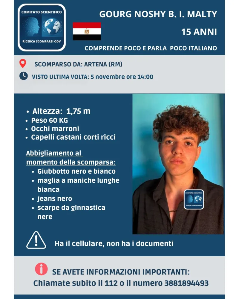 Sono ore di apprensione per Gourg Noshy B. I. Malty, il quindicenne di origine egiziana scomparso da Artena (RM) nel primo pomeriggio di martedì 5 novembre 2025.