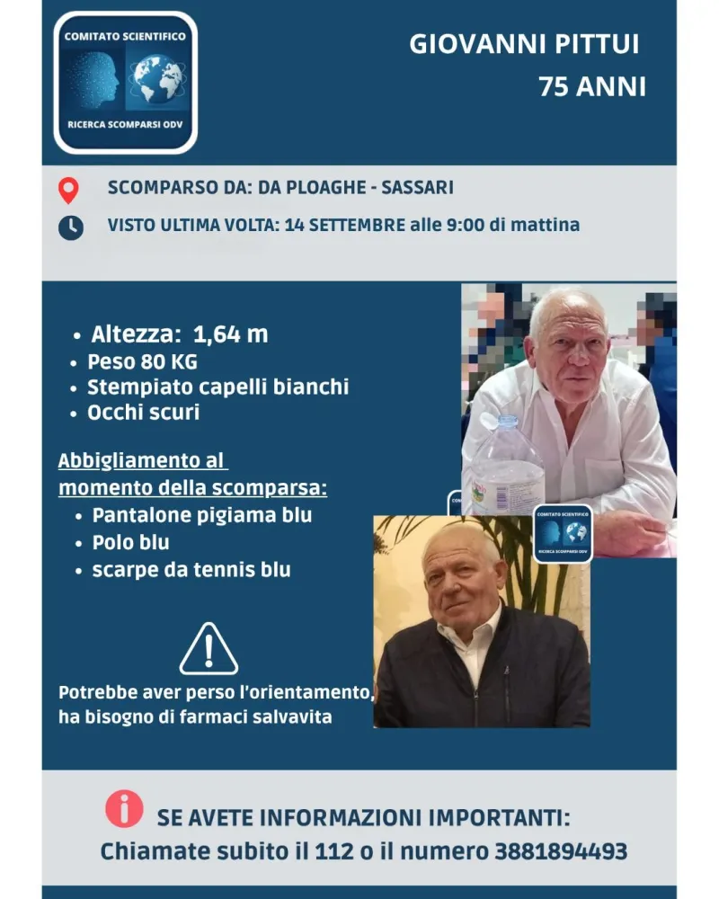 "Se lo vedete per strada, chiamate tempestivamente il servizio d’emergenza al 112, sottolineando di essere a conoscenza della situazione, e contattate anche il Comitato Scientifico Ricerca Scomparsi al +39 388 189 4493", conclude.