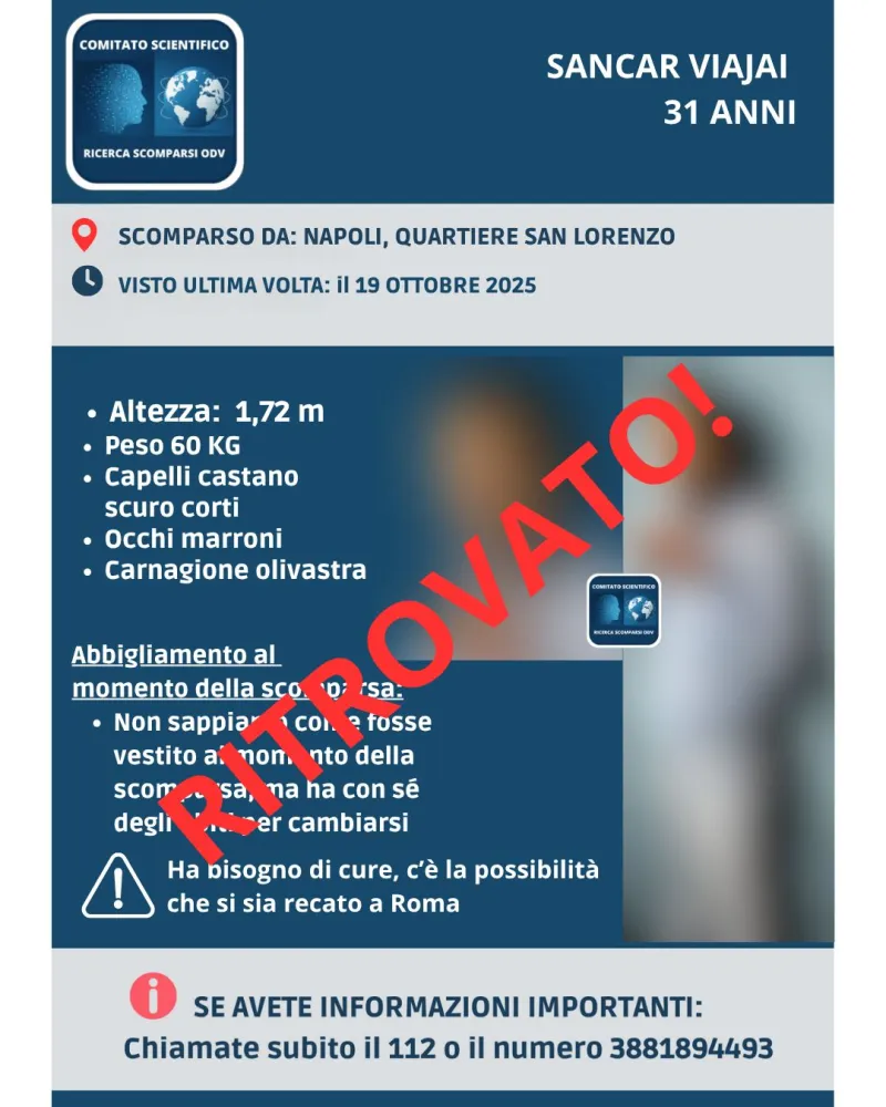 Lieto epilogo per Sancar Vijai, il trentenne scomparso da Napoli lo scorso 25 ottobre 2025 e ritrovato nelle ultime ore dopo giorni di apprensione.