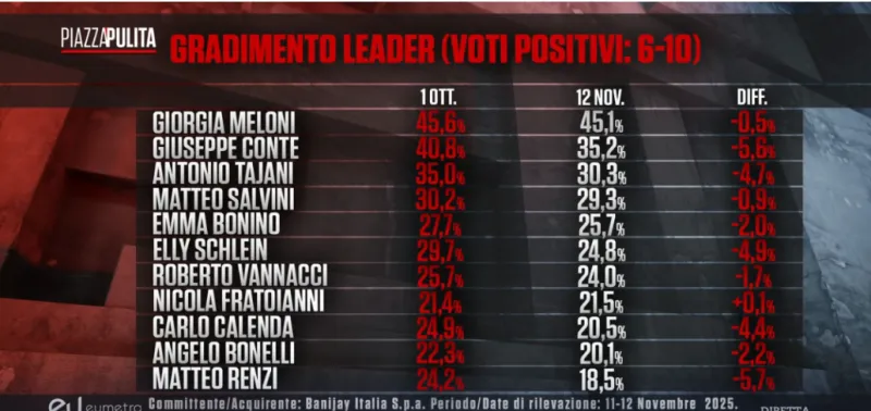Con un gradimento stabile al 45,1%, nonostante un novembre di turbolenze su diversi fronti, Meloni è quasi mezzo punto sotto il suo picco di inizio ottobre, ma resta la personalità politica più apprezzata dagli italiani.