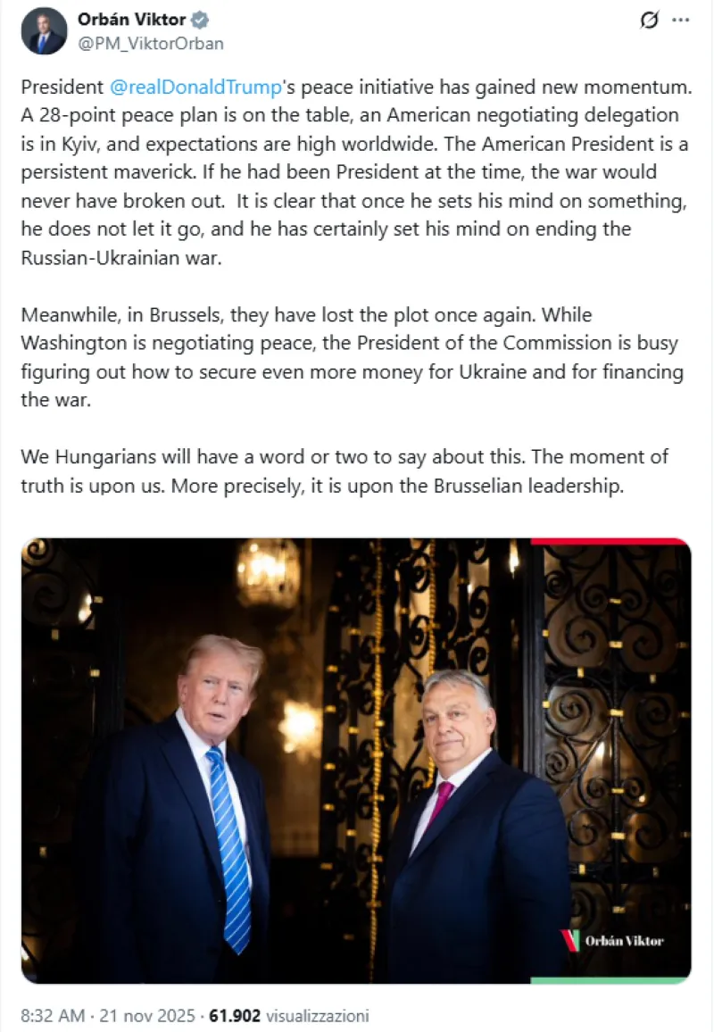 Il premier ungherese ha commentato, il 21 novembre 2025, il piano di pace per porre fine alla guerra in Ucraina.