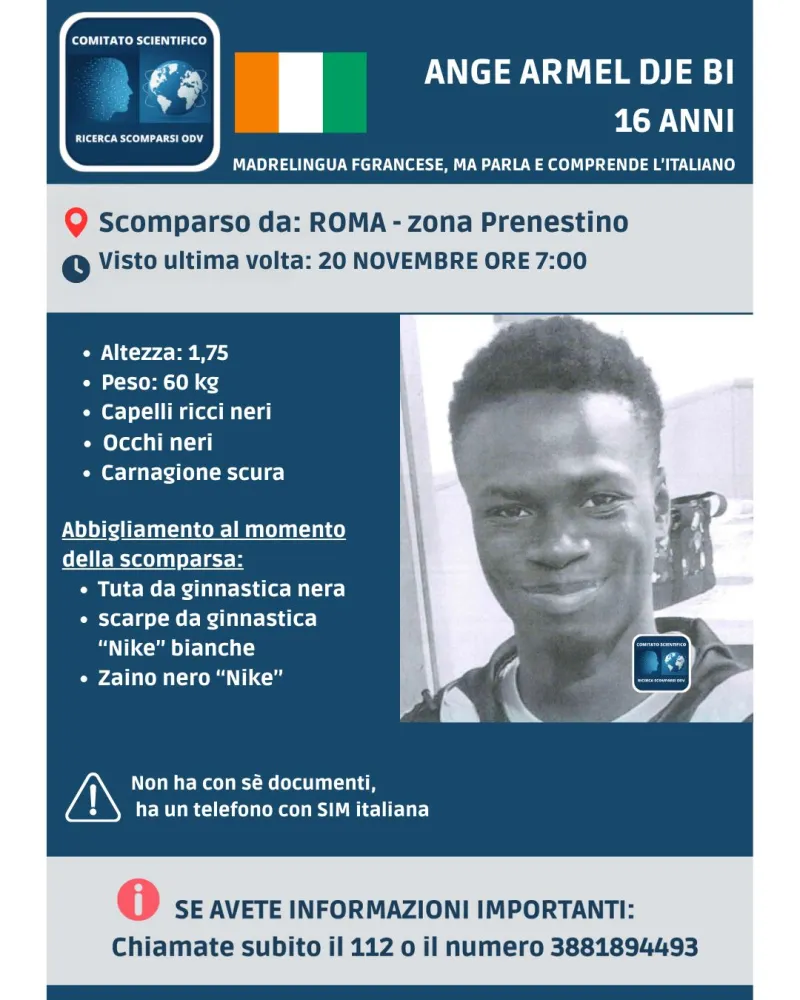 Sono ore di forte apprensione per il sedicenne Ange Armel Dje Bi allontanatosi da una struttura di accoglienza di Roma il 20 novembre 2025.
