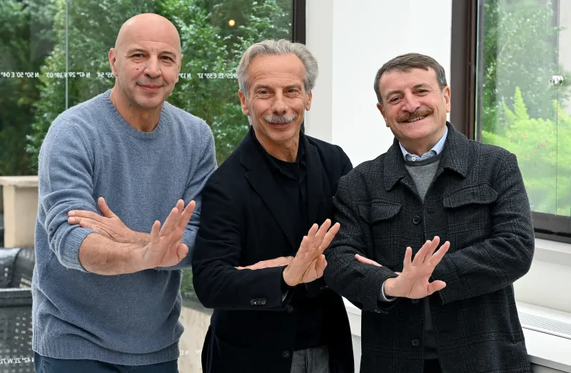 Aldo Baglio (S), Giovanni Storti (C) e Giacomo Poretti durante il photocall del film ''Il Grande Giorno'', Roma, dicembre 2022.