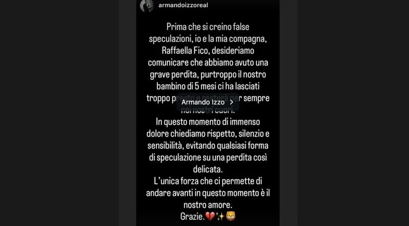 Raffaella Fico e Armando Izzo hanno annunciato sui social di aver perso il figlio mentre la showgirl era incinta al quinto mese. Un dolore enorme, arrivato all’improvviso.