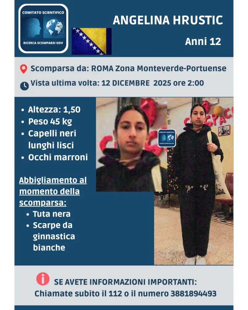 Sono passati tre giorni dalla scomparsa di Angelina Hrustic, dodicenne che si è allontanata da un centro di accoglienza di Roma nella notte del 12 dicembre 2025.