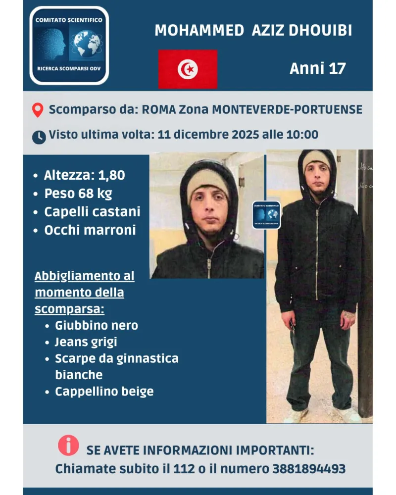 È allerta per Mohammed Aziz Dhouibi, diciassettenne scomparso l’11 dicembre 2025 dal centro di accoglienza in cui era ospitato a Roma.