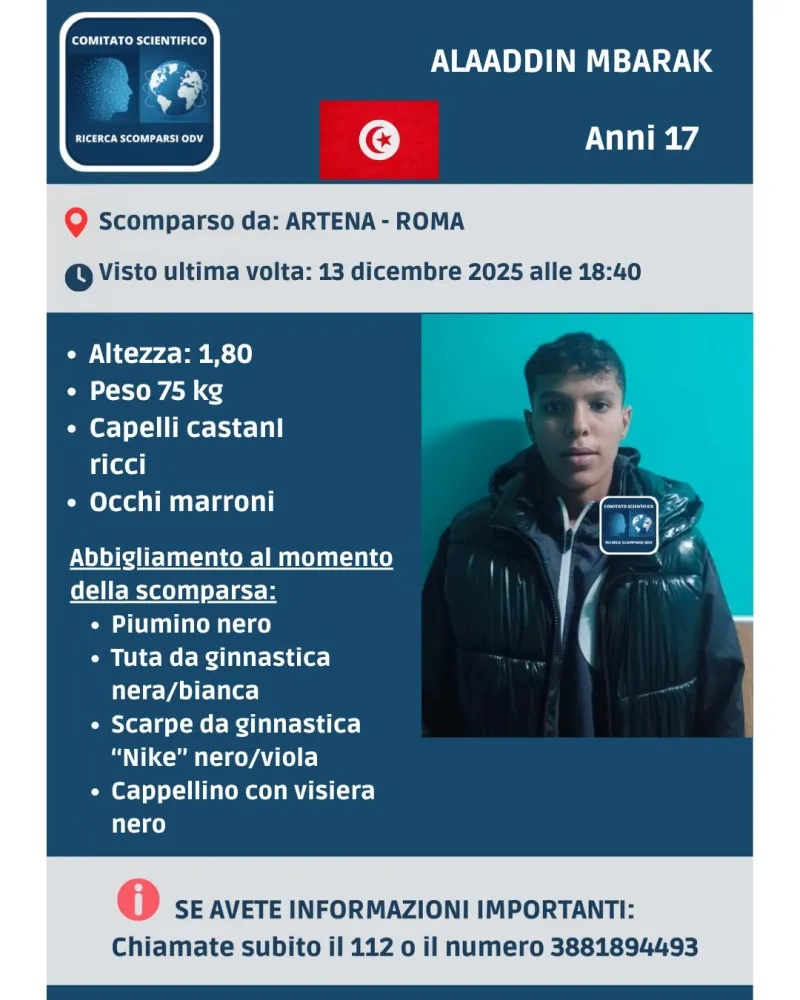 Cresce la preoccupazione per Alaaddin Mbarak scomparso da un centro di accoglienza di Artena, alle porte di Roma, nel tardo pomeriggio di venerdì 13 dicembre 2025.