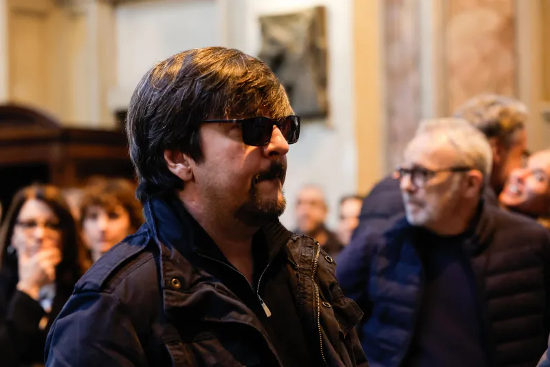 Ricky Memphis alla Chiesa degli Artisti durante i funerali di Antonello Fassari, Roma, 8 Aprile 2025.