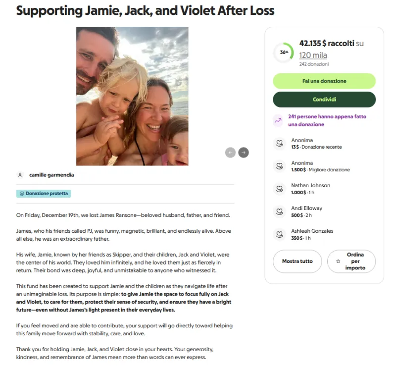La famiglia che Ransone lascia - la moglie Jamie e i figli Jack e Violet - resta volutamente lontana dai riflettori. Anche il gesto di condividere una raccolta fondi per NAMI è apparso come un modo per trasformare il dolore in consapevolezza, senza spettacolarizzarlo.