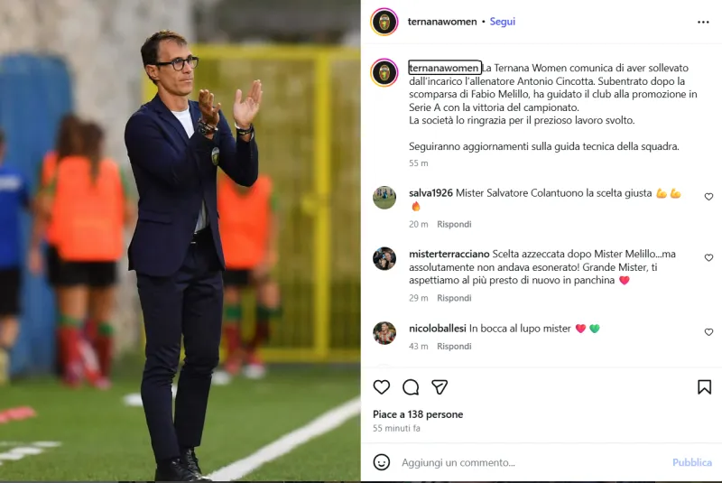 La Ternana Women ha voluto esprimere il proprio ringraziamento a Cincotta per l’impegno e i successi ottenuti, in particolare per aver centrato la storica promozione in Serie A. La società riconosce il contributo dell’allenatore e gli augura il meglio per il futuro.