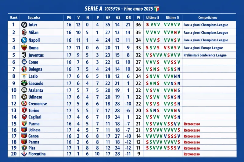 Con tre squadre in due punti in vetta, quattro big con una partita da recuperare e una lotta salvezza già accesissima, la Serie A entra nel 2026 nel modo migliore possibile: incerta, tesa e spettacolare.