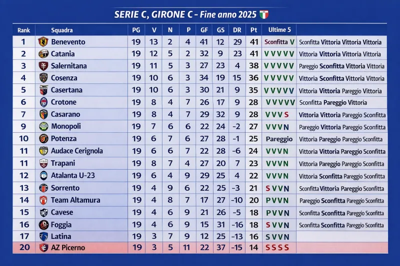 Il Girone C di Serie C chiude il 2025 con un equilibrio spettacolare in vetta e una lotta intensa per playoff e salvezza. Dopo 19 giornate, la classifica mostra squadre di alta qualità che guidano la corsa alla promozione e un fondo classifica molto affollato, con molte squadre in difficoltà.