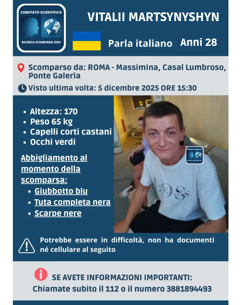 Sono ore di forte preoccupazione per Vitalii Martsynyshyn, 28 anni, scomparso da Roma lo scorso 5 dicembre 2025.