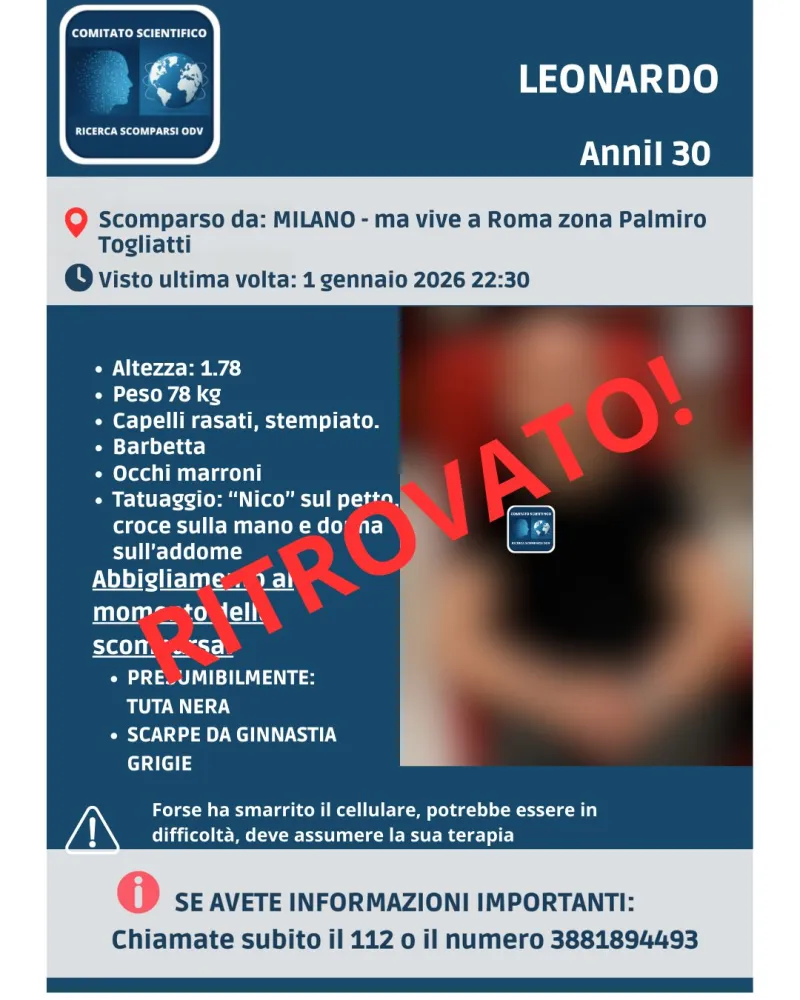 Conclusione positiva per Leonardo Avico, il 30enne di cui non si avevano più notizie dalla serata del 1 gennaio 2026.