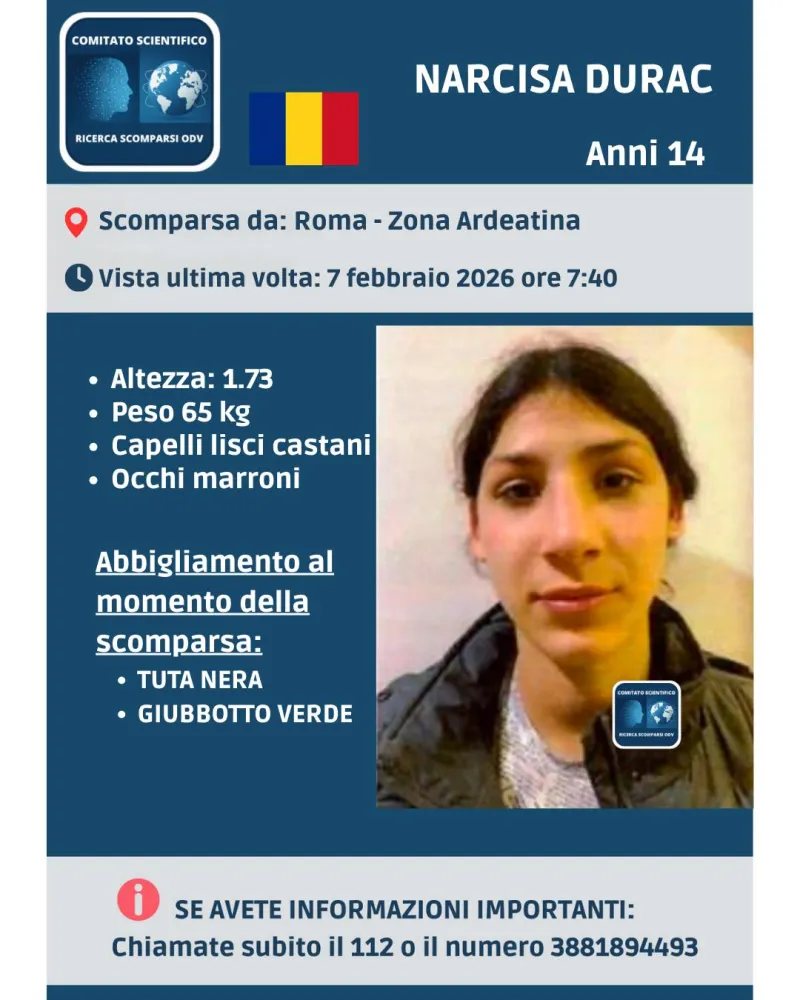 «La scomparsa di Narcisa Durac, una ragazza di soli 14 anni, ci preoccupa fortemente», afferma il Comitato Scientifico Ricerca Scomparsi OdV.