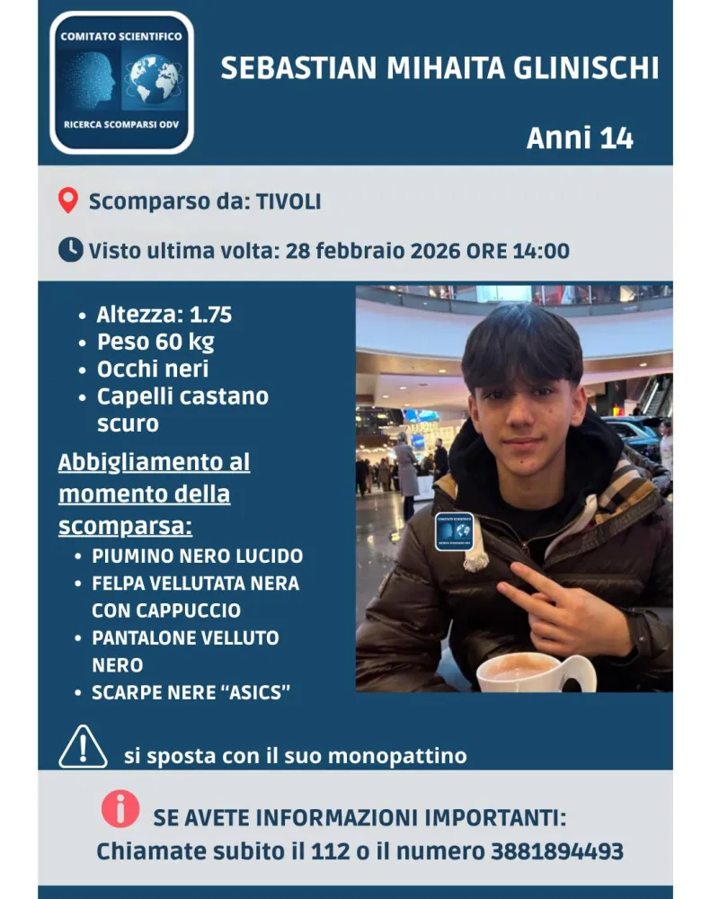 Proseguono le ricerche di Sebastian Mihaita Glinischi, 14 anni, scomparso da Tivoli nel pomeriggio del 28 febbraio 2026.