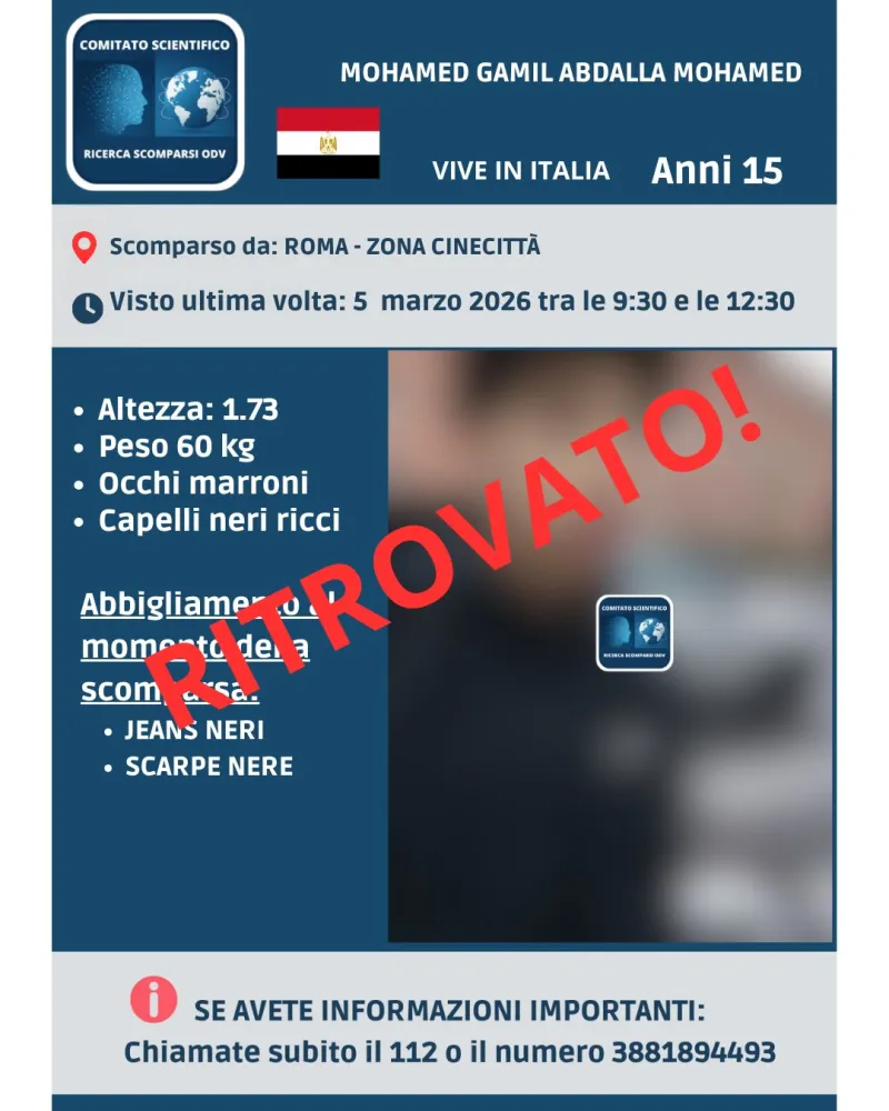 Si è conclusa con esito positivo la vicenda della scomparsa di Mohamed Gamil Abdalla Mohamed, il ragazzo di 15 anni di cui si erano perse le tracce a Roma nella zona Cinecittà nella mattinata del 5 marzo 2026.