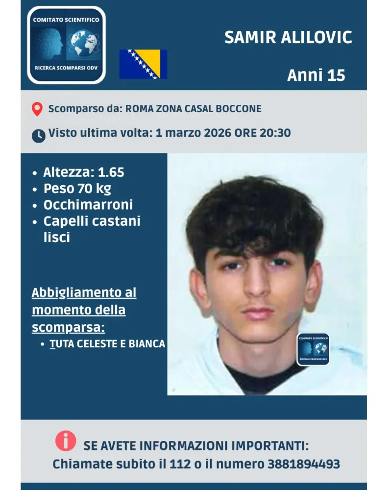 È stato diffuso un appello per ritrovare Samir Alilovic, il ragazzo di 15 anni di cui si sono perse le tracce a Roma nella zona Casal Boccone la sera del 1° marzo 2026.