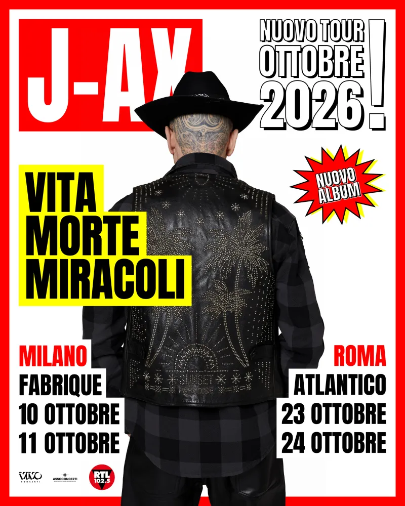 Dopo il successo al Festival di Sanremo 2026 con “Italia Starter Pack”, J‑Ax è pronto a riabbracciare tutti i suoi fan dal vivo con il suo “Vita Morte Miracoli Tour 2026”. I concerti si svolgeranno tra Milano e Roma, nelle location del Fabrique e dell’Atlantico.