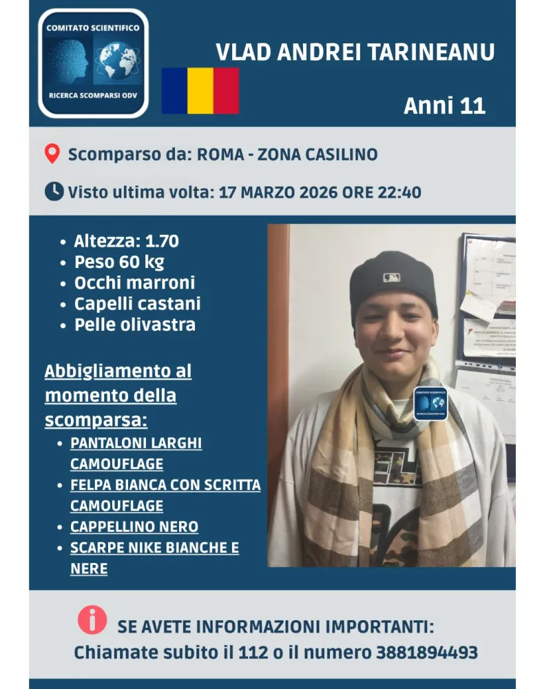 Cresce la preoccupazione per la scomparsa di Vlad Andrei Tarineanu, l’11enne che si è allontanato da un centro di accoglienza nella zona Casilino, a Roma, nella serata del 17 marzo 2026.