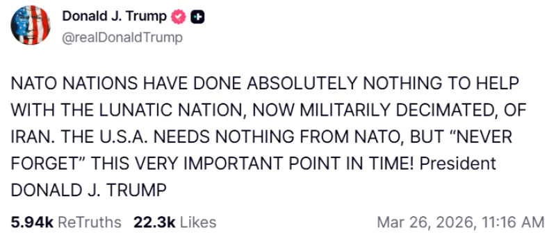 Proprio il 26 marzo, il presidente americano ha nuovamente rivolto le critiche agli alleati della NATO affermando che "GLI STATI UNITI NON HANNO BISOGNO DI NULLA DALLA NATO, MA 'NON DIMENTICATE MAI' QUESTO MOMENTO STORICO MOLTO IMPORTANTE!"