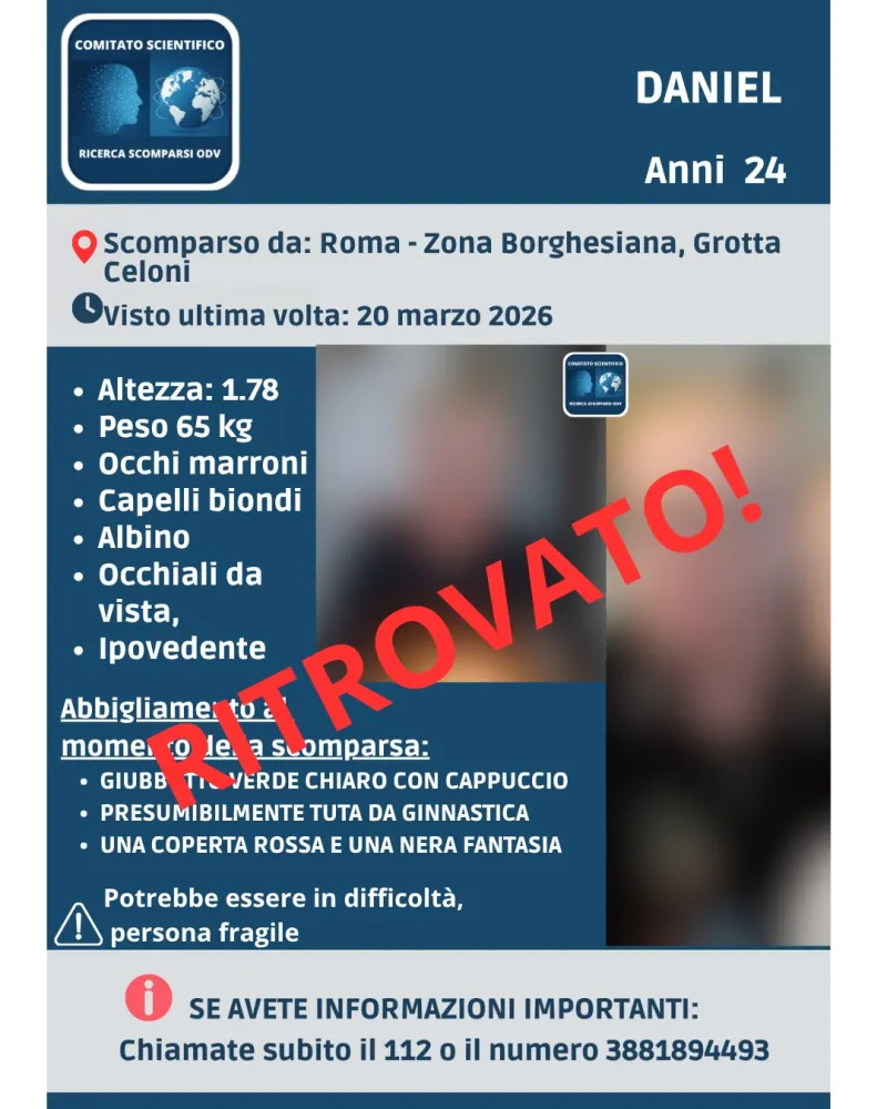 Sono ore di sollievo per i familiari di Daniel, il 24enne scomparso da Roma, in zona Borghesiana-Grotta Celoni, il 20 marzo 2026 e ritrovato nelle ultime ore dopo giorni di forte apprensione.