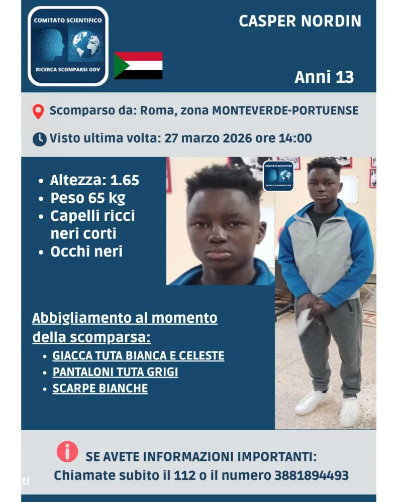 Tiene banco a Roma la scomparsa di Casper Nordin, il ragazzo di 13 anni di cui si sono perse le tracce nel pomeriggio del 27 marzo 2026 dopo l’allontanamento da un centro di accoglienza nella zona Monteverde-Portuense.