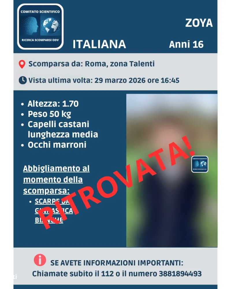 Si chiude con un lieto fine la vicenda di Zoya, la ragazza di 16 anni di cui si erano perse le tracce nel pomeriggio del 29 marzo 2026 dopo l’allontanamento dalla sua abitazione in zona Talenti, a Roma.