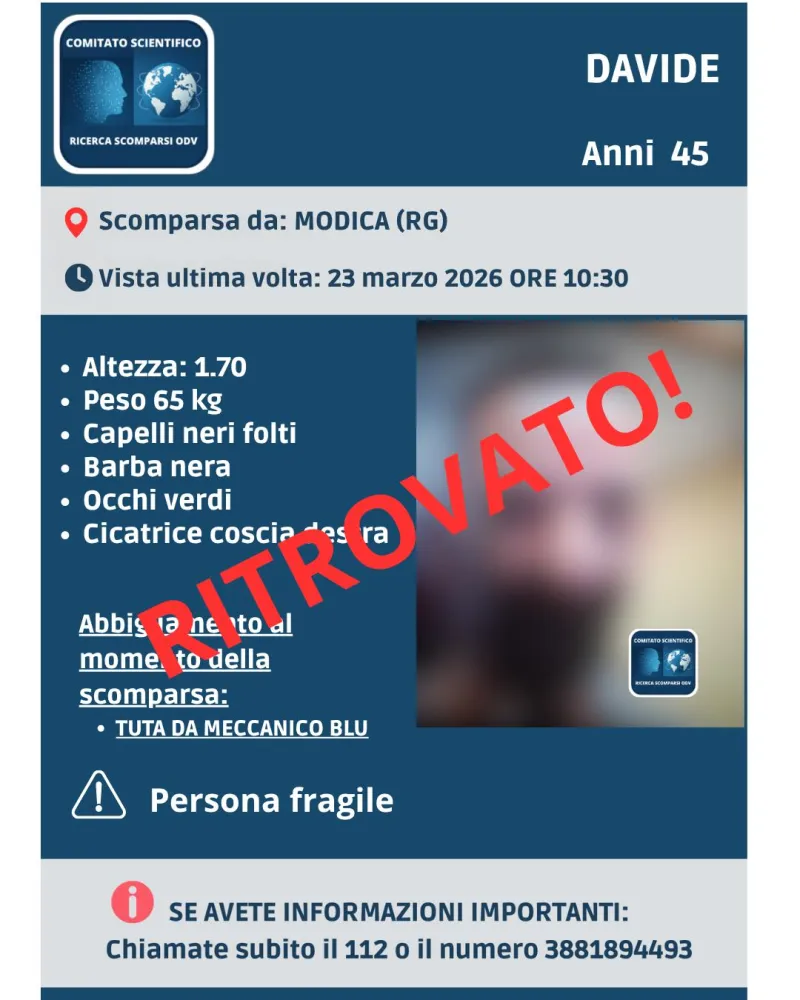 Si chiude con un lieto fine la vicenda di Davide, l’uomo di 45 anni di cui si erano perse le tracce nella mattinata del 23 marzo 2026 dopo l’allontanamento da Modica, in provincia di Ragusa.