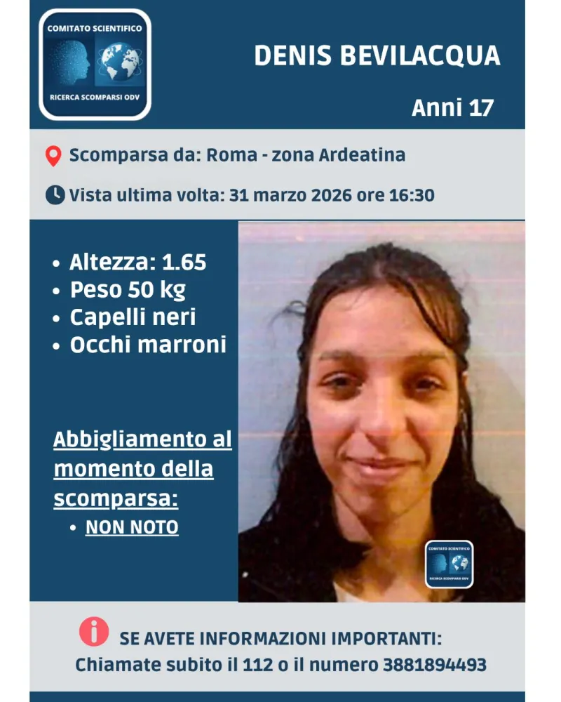 Della giovane Denis Bevilacqua non si hanno più notizie dal pomeriggio del 31 marzo 2026, quando si è allontanata da una comunità situata a Roma, in zona Ardeatina.
