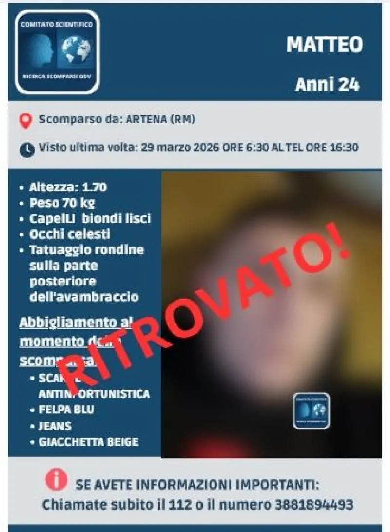 Si chiude con un lieto fine la vicenda di Matteo, il 24enne di cui si erano perse le tracce il 29 marzo 2026 dopo l’allontanamento dalla sua abitazione ad Artena, vicino Roma.