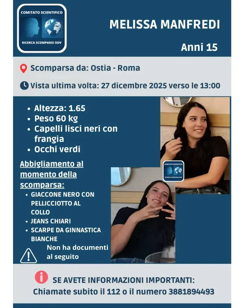 Proseguono le ricerche di Melissa Manfredi, la quindicenne scomparsa da Ostia il 27 dicembre 2025 in circostanze allarmanti.