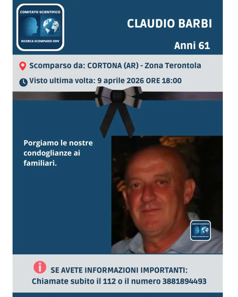 Si è conclusa nel peggiore dei modi la vicenda di Claudio Barbi, l’uomo di 61 anni scomparso nel pomeriggio del 9 aprile 2026 da Terontola, frazione di Cortona, in provincia di Arezzo.
