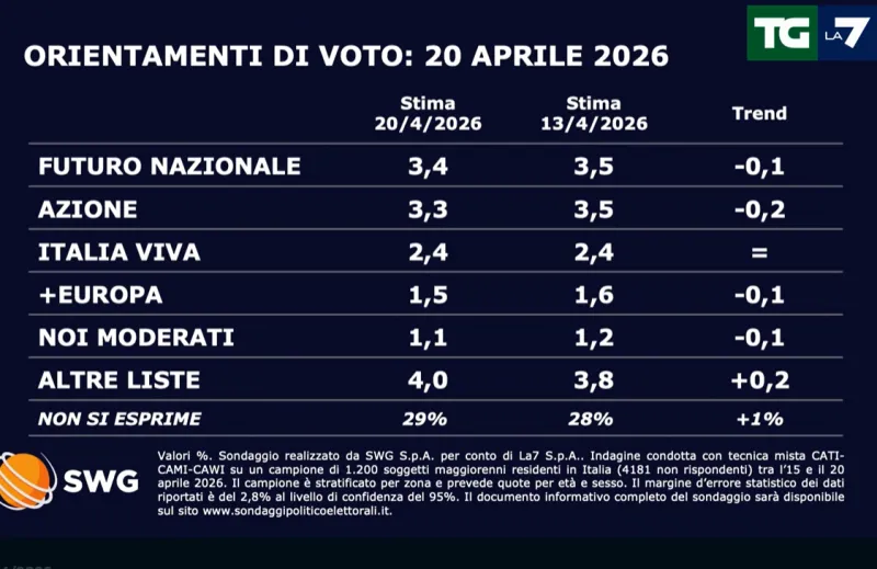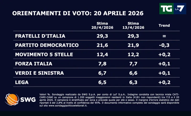 E’ quanto emerso dal sondaggio di lunedì 20 aprile sulle intenzioni di voto degli italiani per le Politiche del 2027, realizzato da SWG per il Tg La7 che offre una fotografia di un panorama politico in fase di assestamento dopo gli stravolgimenti delle ultime settimane.