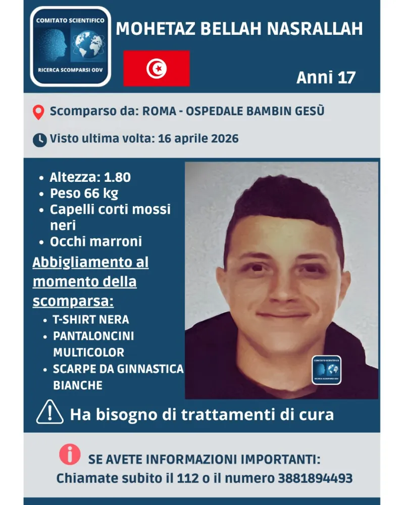Secondo quanto diffuso dal Comitato Scientifico Ricerca Scomparsi OdV, il giovane si sarebbe allontanato dalla struttura sanitaria senza farvi ritorno al termine delle cure. Un elemento che rende il caso particolarmente delicato, anche perché il minore ha bisogno di trattamenti di cura