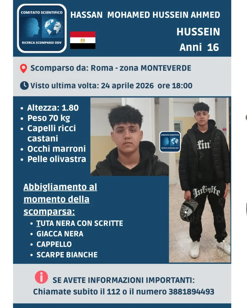 Sono ore di forte attenzione a Roma per la scomparsa di Hassan Mohamed Hussein Ahmed Hussein, il ragazzo di 16 anni di cui si sono perse le tracce dal 24 aprile 2026, dopo l’allontanamento da un centro di accoglienza in zona Monteverde.